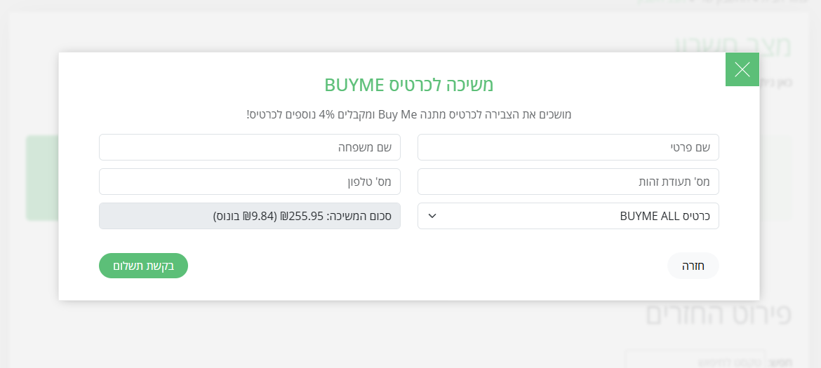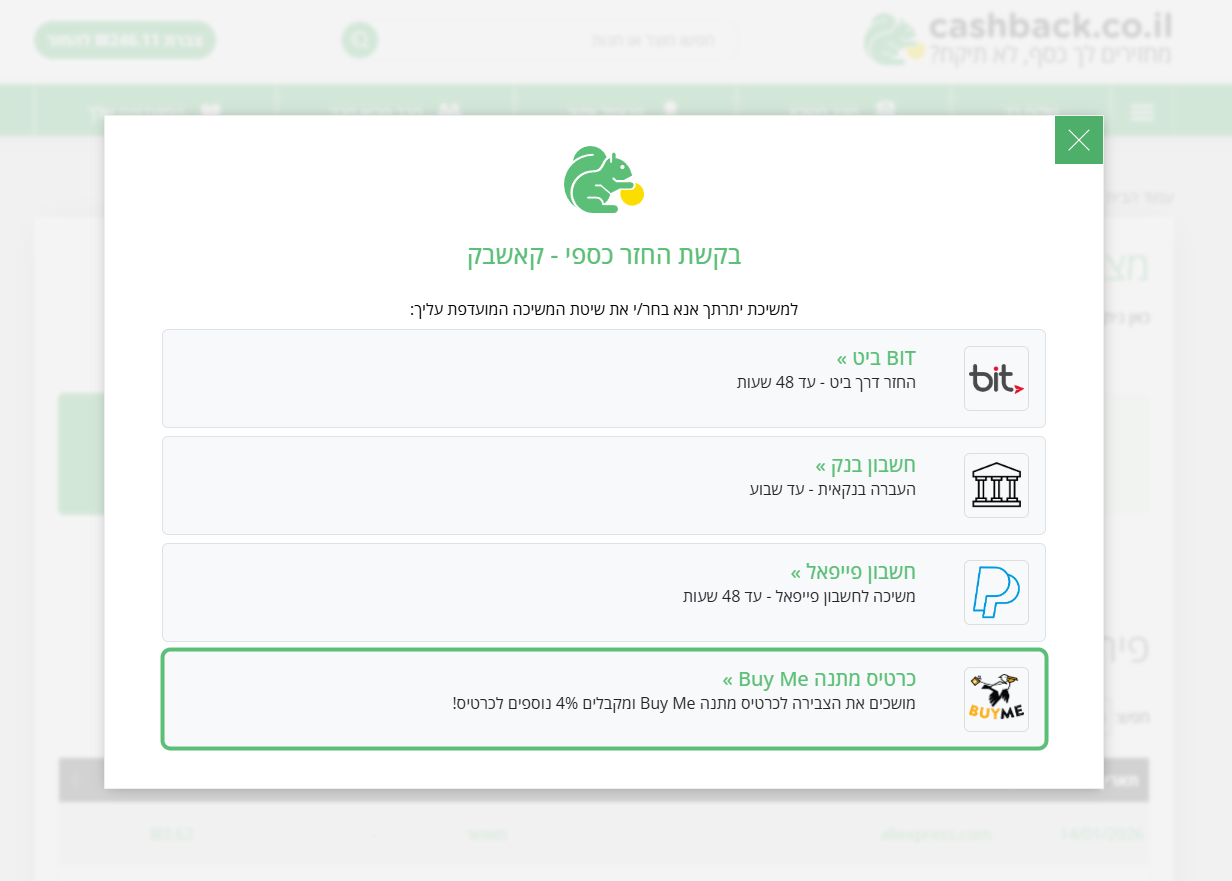 במקום למשוך את הכסף שנצבר לחשבון הבנק, לביט או לפייפאל, ניתן לבחור בשובר ביימי ולקבל אוטומטית תוספת של 4% לסכום. המשיכה מתבצעת בקלות, והבונוס מתווסף מיד - ללא תנאים מיוחדים.לדוגמה: על משיכה של 500 ₪ בקאשבק - תקבלו שובר Buy Me All בשווי 520 ₪.